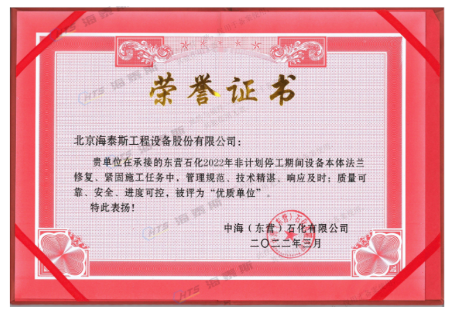 海泰斯為優(yōu)質(zhì)客戶提供的法蘭連接密封完整性管理方案及工程技術(shù)服務(wù), 被授予“二0二一年度A級承包商”榮譽(yù)稱號。